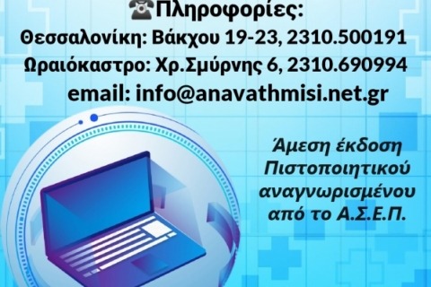 Η ΑΝΑΒΑΘΜΙΣΗ είναι Πιστοποιημένο Κέντρο Δια Βίου Μάθησης από τον Εθνικό Οργανισμό Πιστοποίησης Προσόντων & Επαγγελματικού Προσανατολισμού (Ε.Ο.Π.Π.Ε.Π. – πρώην ΕΚΕΠΙΣ), με αριθμό αδειοδότησης 2000084.